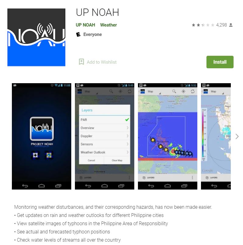 The NOAH PH app is part of the Nationwide Operational Assessment of Hazards (Project NOAH) which seeks to undertake science research and development, and advance the use of cutting edge technologies in government’s disaster prevention and mitigation efforts. Content and data given on this app come from the Department of Science and Technology (DOST) and its participating agencies in the Philippines.